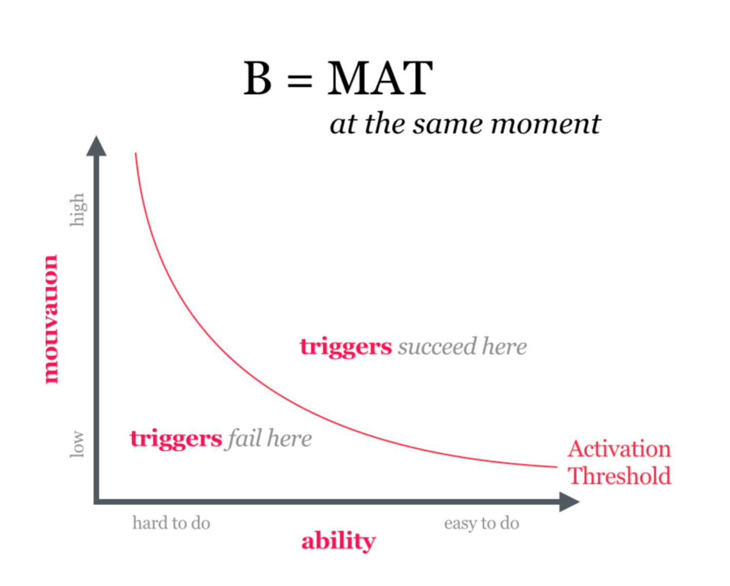 According to the BJ Fogg model, the best way to hook users is to influence user behaviour and create habits. The model explains how users behaviour is influenced by three main aspects. Motivations, ability and triggers which can be written in the following format: Behaviour = Motivation x Ability x Trigger. When a desired behaviour does not appear, at least one of these three is missing.