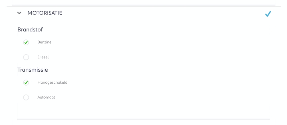 The participant had no clue what the version option included. The first thing that came to mind, when reading the version titles, was the option of the car interface. The participant suggested that the word version could better be changed into a variant. Next, the version option could only be selected through a dropdown menu, even if there is only one option. The participant suggested to leave out the dropdown and set up clear defaults. When the participant chose a version, the participant noticed that the motorisation actually performed as a filter option. This should be a specific mode on a single page because it is an essential part of the process. Also, the price indication of the versions is not presented, the participant was surprised when the car prices rose significantly.