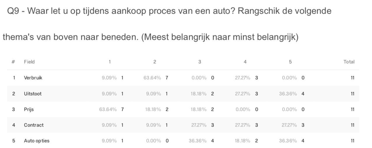As the figure above shows, the price is the most important without a doubt. Because signing a contract or buying a car is a moment where people are careful, providing a live (correct) price is essential. As second, people rate consumption. As consumption determines the variable costs (gasoline or diesel), people that a close look at the consumption level. People became more diverse after these two opinions. Where the first two places are directed in the same direction, the last three are diverging. People tend not to care so much about the contract in the first place, see prices always in the top three concerns and tend to care less about the pollution.