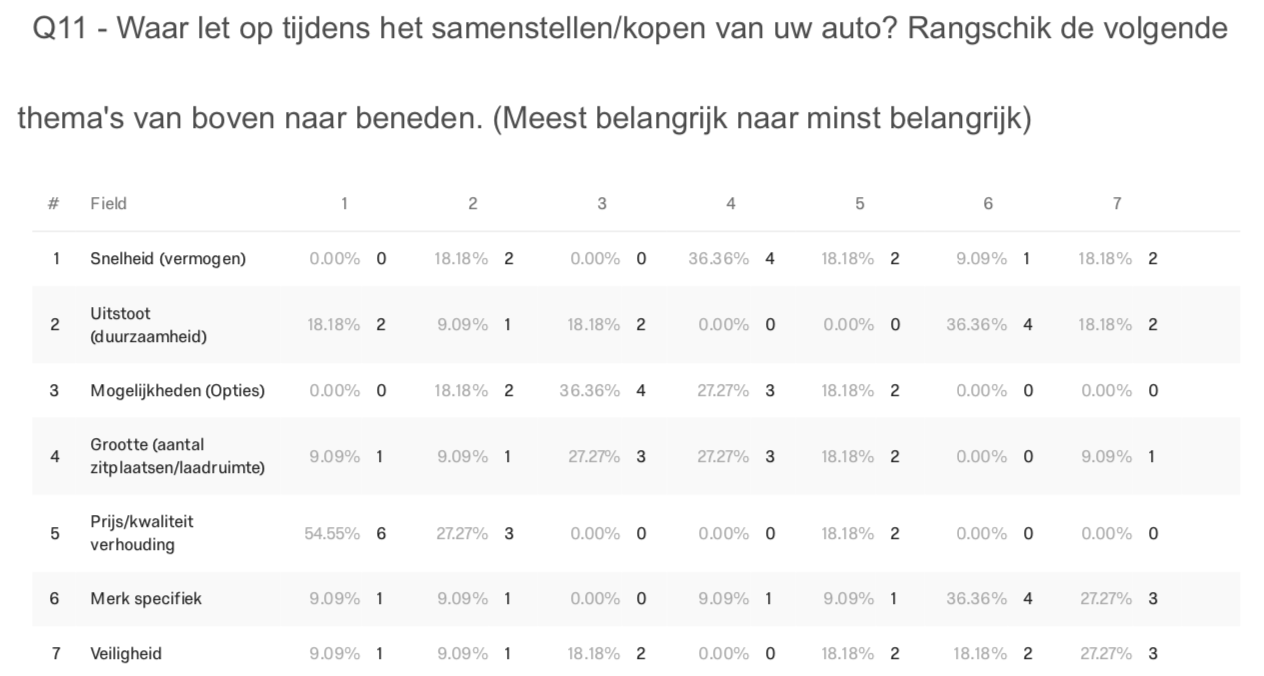 The first valuable insights rose from the question about what people find important while purchasing a car. I ask the participants to rank the question from one to five, where one is the most important and five the least.