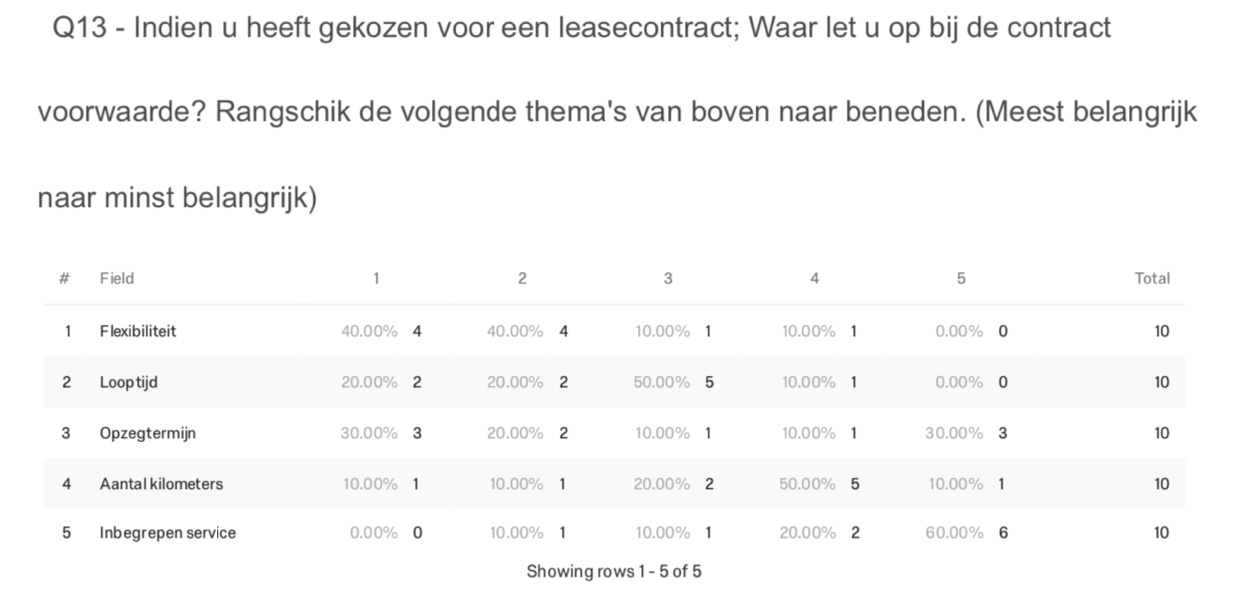Not all participants were likely to have a lease contract, but the one who did, I asked to rank the most important contract features. The figure shows a perfect funnel interest. In the first two places, flexibility is preferred. Secondly, duration place an important role. Right after, mileage takes place four. And the least relevant feature is in included services. The figure tells me that I should take the flexibility and duration into account prominent.