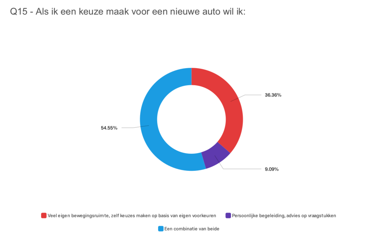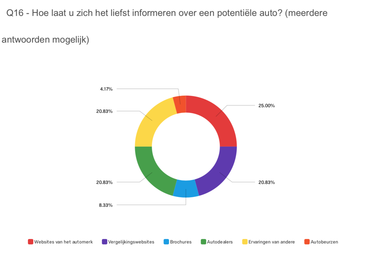 Finally, I asked how people inform themselves about their potential car. I assumed that people nowadays use the internet mainly, and the answers validate that. A fourth of the participant use websites to be informed. Comparison websites, word of mouth and car dealers, share the second place with exactly the same amount of interests. Comparison websites and word of mouth, both form a solution for the problem by facilitating the opinion of others, while car dealers are the expert reviews. The big difference is that car dealers will do everything to let you buy, while comparison websites and word of mouth let you reconsider your decision. The fact that people care much about other opinions, shows me that I should provide users with reviews and ratings at product pages, or model overviews. And next to that, people are more likely to be more expertly informed by car dealers, which means I should not use difficult content that people need to figure out themselves.
